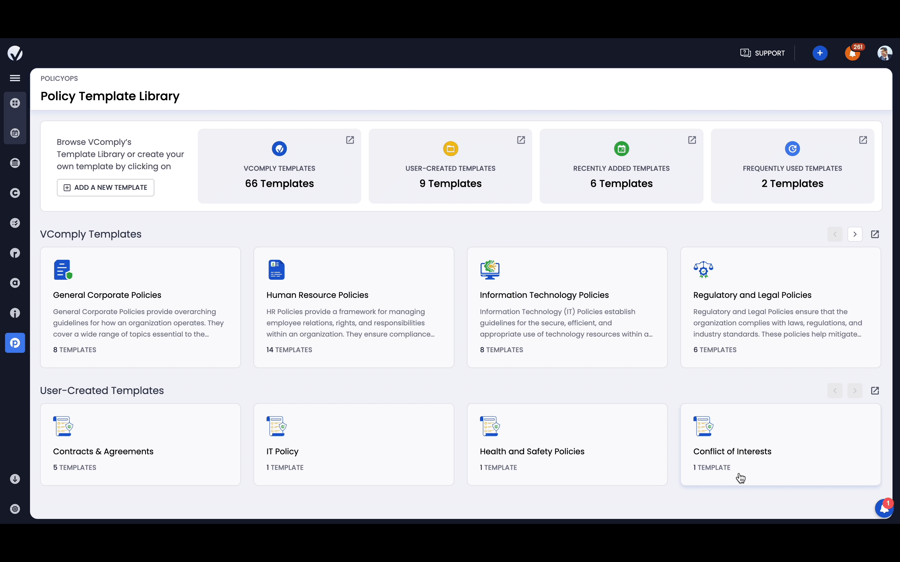 Maintaining consistency across policies is essential to ensure they’re easy to understand and follow. VComply offers a wide selection of pre-loaded templates that can be fully customized to meet each organization’s unique needs. These templates maintain uniformity in language and structure, making it easier for organizations to scale their policy management efforts across multiple departments and regions.